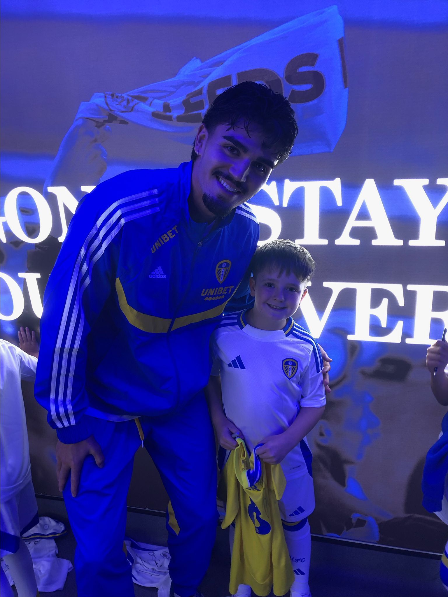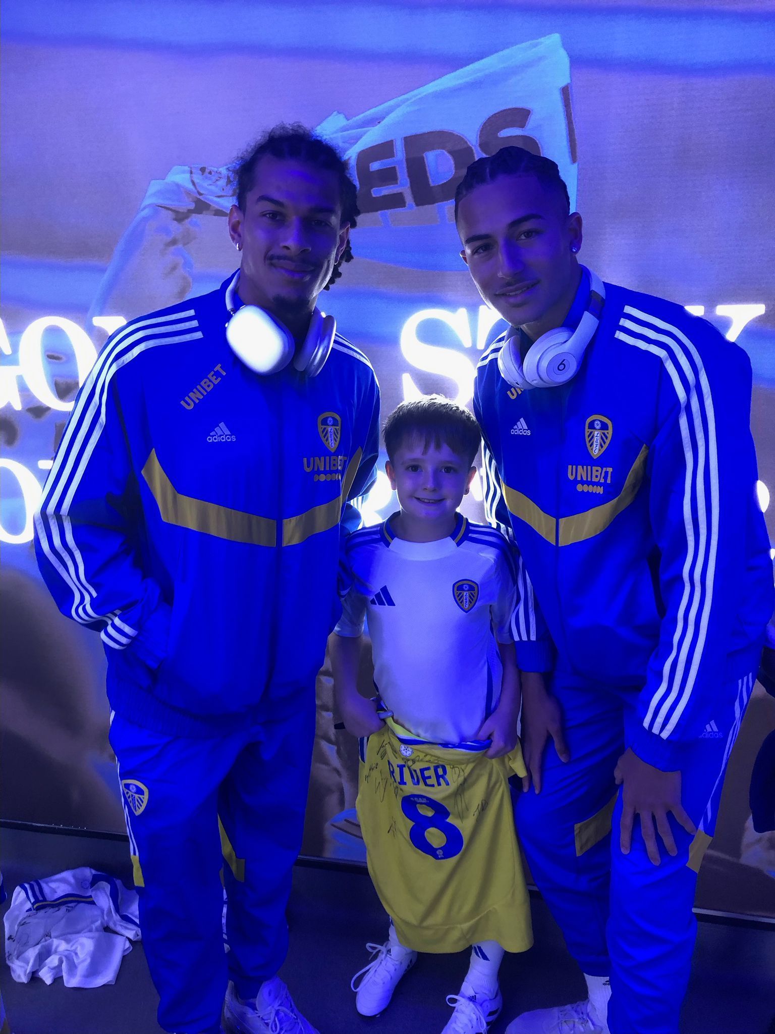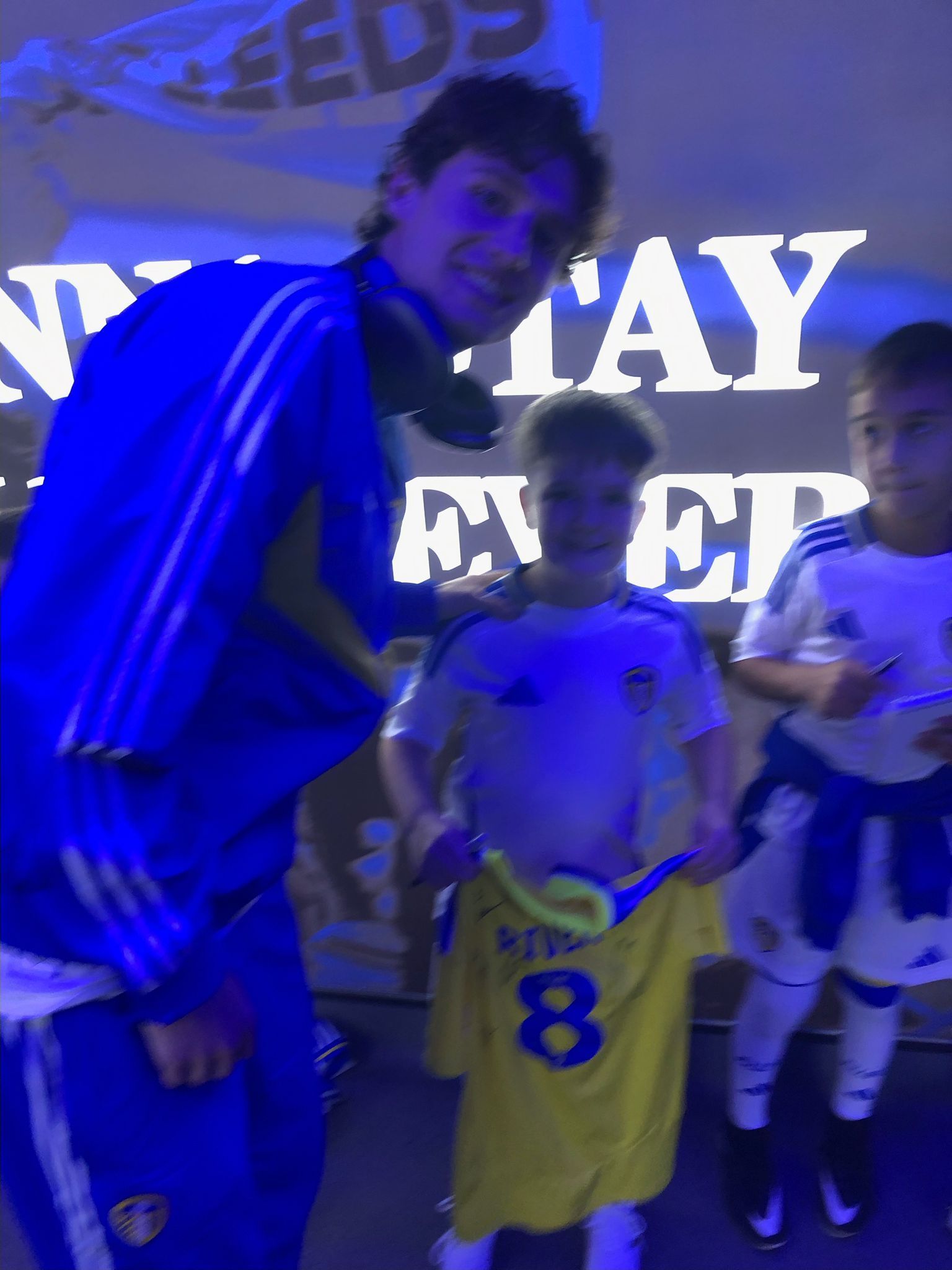 River got given a full Leeds home kit as well as a bag of goodies too, then off he went to meet the Leeds players, he was very excited to meet Gnonto as he is his favourite player! He took his away kit shirt with him and they all signed it for him.